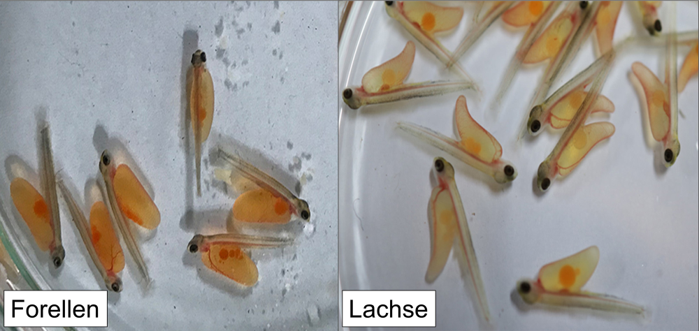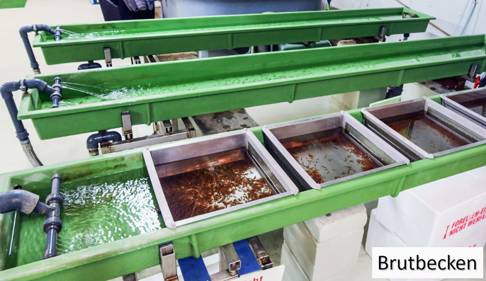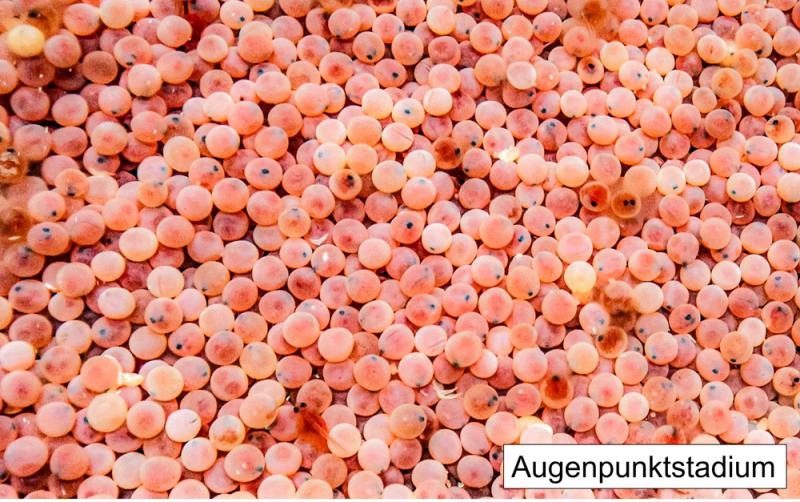 Unsere Fischaufzucht beginnt Anfang Januar mit befruchteten Eiern im sogenannten Augenpunktstadium, die wir von geeigneten Lieferanten beziehen. In speziellen Unterstromkästen werden die Eier von sauerstoffreichem Wasser umströmt und verbleiben dort bis nach dem Schlüpfen der Brütlinge. In der ersten Zeit bleiben die frisch geschlüpften Fische in langen Brutrinnen und werden anschließend in Rundbecken umgesetzt. Im Mai oder Juni werden die Jungfische schließlich in die Gewässer ausgesetzt.