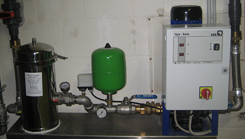 Um den Brutwassernetzdruck auf 2 – 5 bar zu erhöhen, wurde eine Druckerhöhungspumpe installiert. Eine DE-Pumpe, welche druckabhängig ein- und ausschaltet.