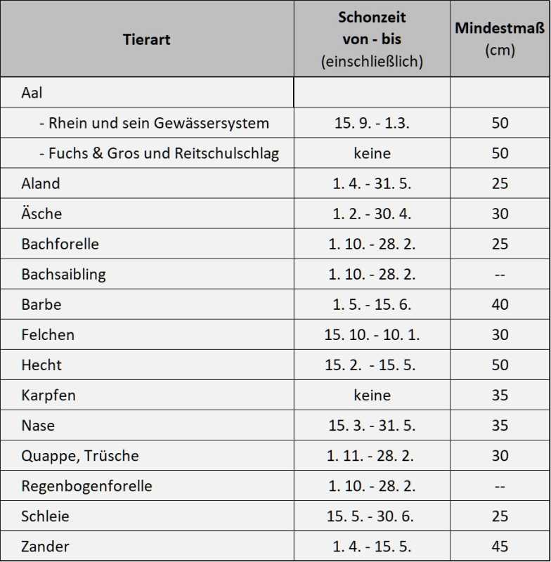 - Für folgende Arten gilt ganzjährige Schonzeit: Alle Neunaugen (Cyclostomata), Atlantischer Stör (Acipenser sturio L.), Lachs (Salmo salar L.), Meerforelle (Salmo trutta f. trutta L.), Wandermaräne (Nordseeschnäpel) (Coregonus oxyrhynchus L.), Maifisch (Alosa alosa Cuvier Finte) (Alosa fallax Lacépède), Frauennerfling (Rutilus pigus virgo Lacépède), Strömer (Leuciscus souffia agasizzi Cuvier & Valenciennes), Schneider (Alburnoides bipunctatus Bloch), Zährte (Vimba vimba L.), Bitterling (Rhodeus sericeus amarus Bloch), Schlammpeitzger (Misgurnus fossilis L.), Steinbeißer (Cobitis taenia L.), Schrätzer (Gymnocephalus schraetzer L.), Streber (Zingelstreber Siebold), Zingel (Zingel zingel L.), Groppe (Cottus gobio L.), Dohlenkrebs (Austropotamobius pallipes Lereboullet), Flußperl-, Fluß- und Teichmuscheln (Gattungen Margaritifera, Unio, Anodonta und Pseudanodonta).