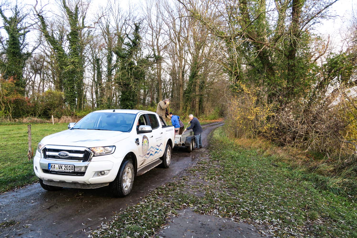 Die Arbeitsgruppe des AVK trifft sich und Jens Toso, Bereichsleiter Einsatz, Unterhalt und Pflege, bespricht mit der Gruppe den Arbeiteinsatz. Heute steht die Ausbesserung der Zufahrtswege zum Knielinger See auf dem Programm. Insbesondere die Wege zum und am Westufer des Sees werden durch die zu den Angelplätzen fahrenden Autos stark beansprucht. Sie weisen mittlerweile einige Schlaglöcher auf und es ist an der Zeit für Ausbesserungsmaßnahmen.