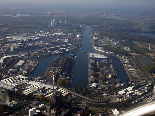 Der Rheinhafen Karlsruhe ging 1901 in Betrieb. Mit diesem Tag verlor der „Alte Hafen Leopoldshafen“ als bisheriger Umschlagsort für die Region Karlsruhe völlig an Bedeutung. Er besteht aus sechs Hafenbecken mit beantlichen 71 ha Wasserfläche. Fünf sind angelegt wie die Finger einer Hand. An dem Zulaufstrecke vom Rhein ist ein großes Containerterminal angesiedelt, an dem riesige Einzelschiffe bis zu 135 Meter Länge festmachen. Der Karlsruher Hafen wurde schnell zu einem der umschlagsstärksten Binnenhäfen Deutschlands. Er besteht aus sechs Hafenbecken, wovon fünf wie die Finger einer Hand angelegt sind. Becken VI, das früher ein schmaler Kanal war, stellt die Verbindung zum Rhein dar. Einzigartig ist das Sperrtor an der Hafeneinfahrt, das bei einem Hochwasserstand ab 7,50 Metern bei gleichzeitiger Einstellung der Schifffahrt auf dem Rhein geschlossen wird. Hierdurch wird die Lücke zwischen den Dämmen beiderseits des Hafens geschlossen und die Anlagen im Hafen vor Überflutung und die Umwelt vor Gefährdungen geschützt.